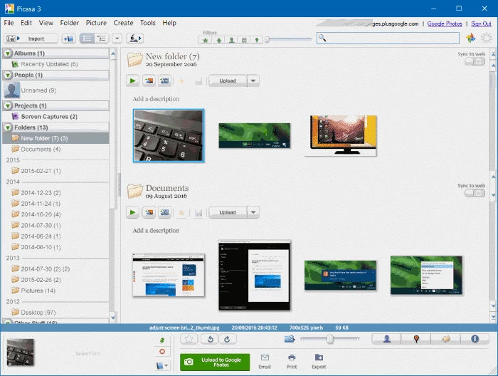 يُرتب برنامج بيكاسا صورك تلقائيًا في ألبومات أنيقة، مرتبةً تاريخيًا. يُمكّنك من العثور على مجلد الصور بسهولة. يدعم هذا البرنامج صيغ JPEG وGIF وBMP وPSD ، بالإضافة إلى ملفات الأفلام، وهو مُناسب تمامًا للكاميرات الرقمية.